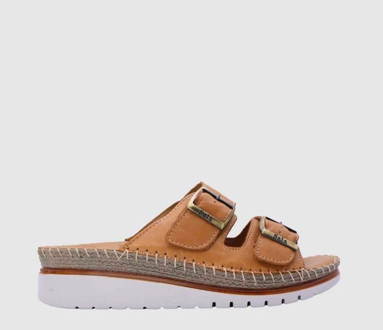 Experience timeless comfort with the Sala Oasis leather slide, featuring a classic black and coconut color combination. Designed with a soft sole for all-day wear, it includes an adjustable buckle for a personalized fit. Jute detailing adds subtle texture and natural elegance, making this slide a versatile choice for both casual and refined occasions. Crafted with expert attention to quality and style.