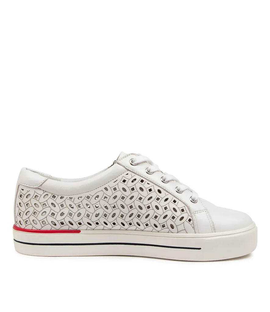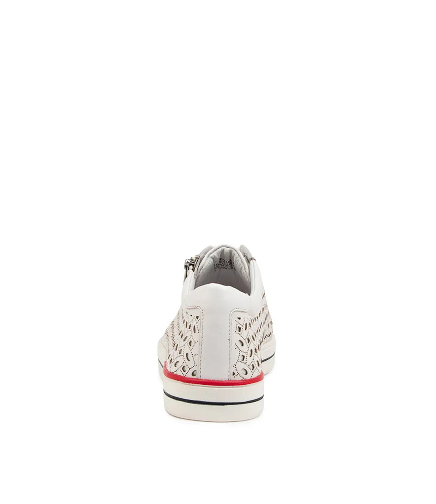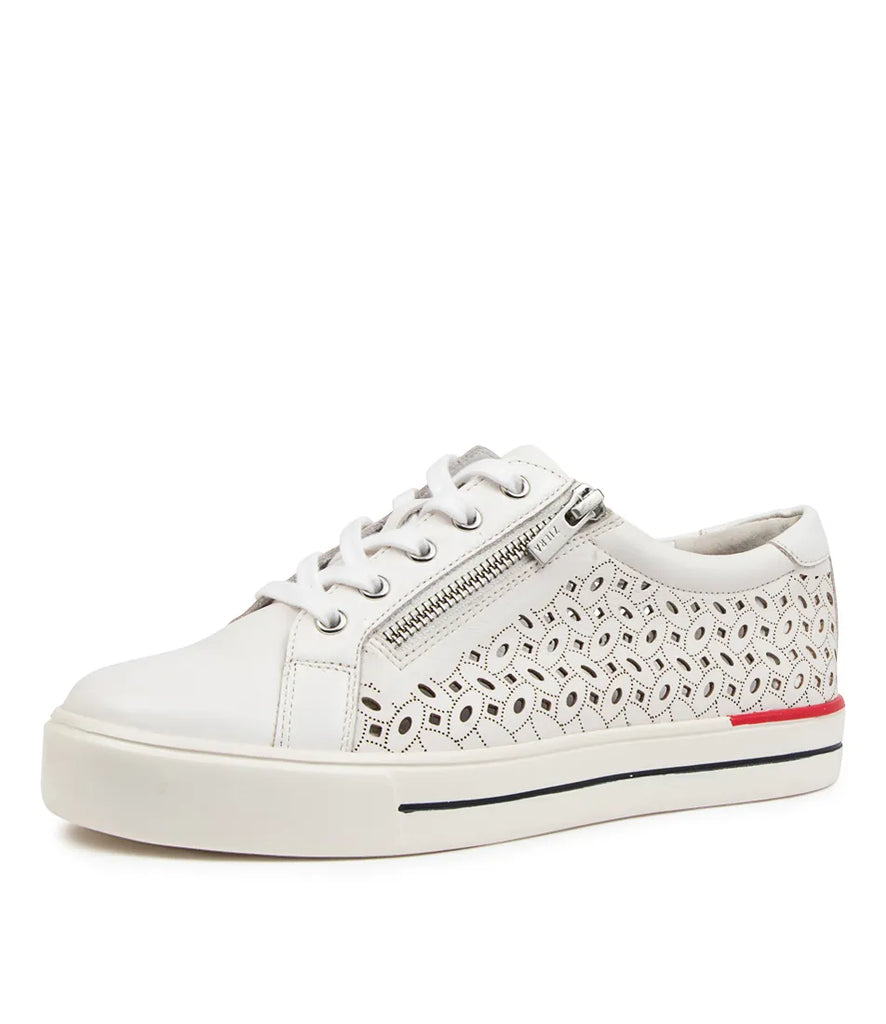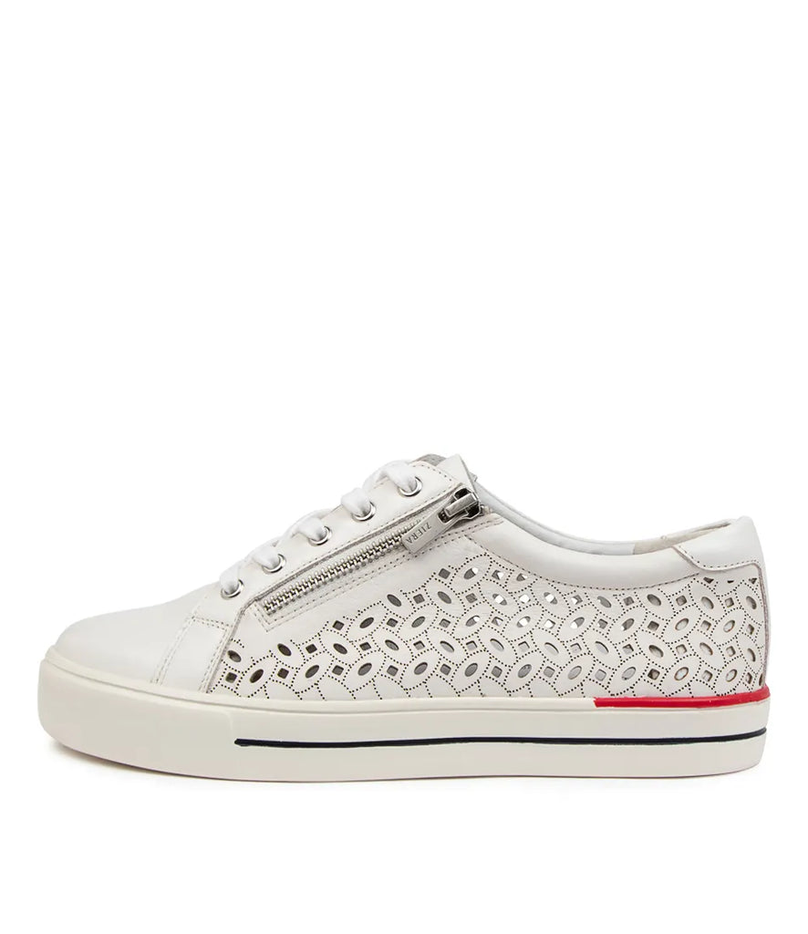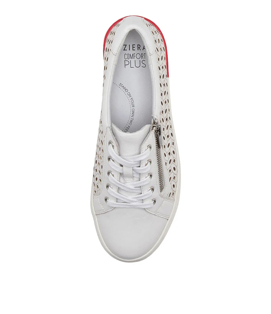 Part of the Ziera Lite range featuring a lightweight rubberised EVA sole, AYLEEN is a modern sneaker crafted from premium leather in a laser cut finish with a lace-up front and edgy zip trim. It includes two different sets of laces to customise your look! The pair are fitted with a removable Comfort Plus footbed to promote optimal alignment and a natural stride, easily switched out for personalised orthotics. A gel lining offers extra shock-absorption, while a TPU cradle supports and cups the foot from heel to arch. This style features the Ziera XF fit, allowing the fit to be customised by adding, layering or removing the included forefoot inserts.